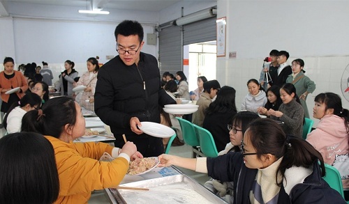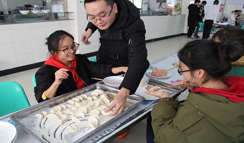 下午14:00,活动准时开始。同学们首先在新月楼食堂固定位置准备就绪,跃跃欲试。随后,同学们围坐在一起,以寝室为单位,都开始亲手实践,每组同学别出心裁地包着饺子并设计成各种形状,饱含着各种意义。在包饺子的同时,大家围绕学习、生活、工作等话题不时交谈着,老师与同学们亲切的互动,用爱包起了一个个饺子,师生情感也随之加深。随后同学们包的饺子被送进了厨房,开始煮水饺、蒸水饺,在这期间,同学们也没有闲着,一个个别开生面的节目让等待不再煎熬。终于,在大家的不懈努力下,一碗碗热气腾腾的饺子在大家的期待中被端上了餐桌,吃着自己包的香喷喷的饺子,同学们不仅感受到了青春的快乐,还感受到了集体的温暖,脸上都洋溢着幸福快乐的微笑。
