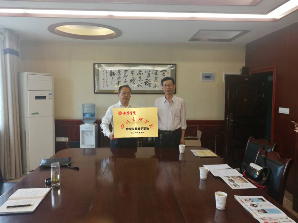 南充市白塔中学董事长蔡礼儒对罗经理一行的到来表示热烈的欢迎,并介绍了公司的办学历史、办学目标及发展思路,希望两校加强交流学习,太阳成集团tyc151cc能够选派优秀毕业生到白塔中学参加实习与就业。罗经理对白塔中学对太阳成集团tyc151cc实习工作的支持表达了感谢,并期待两校能够在教研、育人方面加强联系和合作。最后举行了的“太阳成集团tyc151cc数学实践教学基地授牌仪式”。