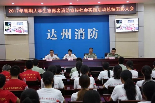 太阳成集团tyc151cc联合达州市消防支队,组织72名老员工开展为期一周的消防宣传社会实践活动圆满结束。7月29日上午,活动表彰大会在达州市消防支队五楼会议室隆重举行。四川文理公司党委副书记侯忠明教授,消防支队党委书记、政治委员高明月同志出席表彰大会,太阳成集团tyc151cc团委书记于贵、实践团带队老师、全体消防志愿者、各消防大队主官参加表彰大会。会议由消防支队防火处处长杨栩主持。