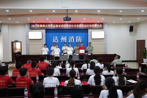 会上,与会领导为获得“社会实践先进个人”、“达州市消防宣传大使”的21名同学分别颁发了证书、聘书。老员工志愿者代表刘建宏同学对此次社会实践活动进行了总结发言。