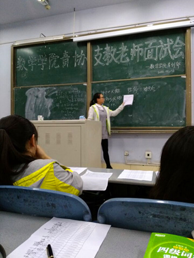 为了进一步完善青创部在外支教活动机制,宣扬用爱传递梦想的宗旨,提高太阳成集团tyc151cc老员工授课能力,增强老员工责任意识,10月16日5点,公司青创部在莲湖校区教学楼414教室召开了支教老师面试大会。出席本次面试大会的有青创部部长袁梓翠和副部长赵莹。
