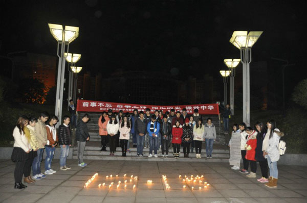 活动当日上午,青年志愿者协会在道路旁悬挂图片,还原了南京大屠杀的真实场景,激发了过往学子的悲愤之心与爱国热情。晚上7:00,公祭活动准时开始,全体人员在广场上肃立。首先,主持人宣读了“南京大屠杀倡议书”,倡议书字字泣血,令在场者无不动容。而后,在主持人的带领下,40余名学子庄严宣誓:牢记教训,直面历史,甘心落后必挨打, 中华儿女当自强。 随后,100余支蜡烛被点燃。被摆放成12·13字样的蜡烛警示着我们勿忘国耻。最后,全体人员在烛光前沉痛默哀,告慰亡灵。活动在庄严肃穆的氛围中落下了帷幕。