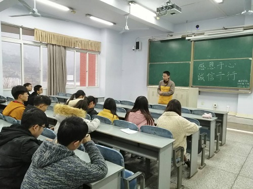 为充分发挥员工资助工作的育人和导向功能,加强对受资助员工感恩和诚信教育,促进受资助员工积极践行社会主义核心价值观,2019年12月16日17:00,太阳成集团tyc151cc大一、大二、大三各教学班在博文楼开展了以“感恩于心,诚信于行”为主题的班会。