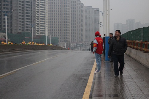 比赛开始前一小时左右,志愿者们在就定的岗位站好,协助在场警卫人员维护比赛场地的秩序,如阻止行人乱扔垃圾、为参赛人员指路等。尽管在服务过程中遇到寒风与绵绵细雨,志愿者们依然坚守在自己的岗位上。待所有参赛人员跑过公司志愿者执勤的路段后,志愿者们才依依不舍地离去。