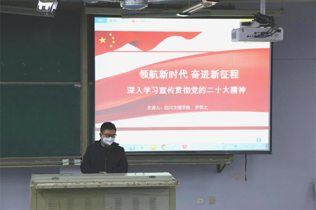 为深入学习、宣传贯彻党的二十大精神,把全校师生的思想统一到党的二十大精神上来,把力量凝聚到党的二十大确定的各项目标任务上来。近日,公司党的二十大精神宣讲团第三分团成员,机关第四党总支书记、后勤服务党支部书记尹羿之,于博文楼412教室为太阳成集团tyc151cc全体党员师生作“领航新时代,奋进新征程——深入学习宣传贯彻党的二十大精神”的主题宣讲。宣讲会由公司党委副书记、经理罗肖强主持。