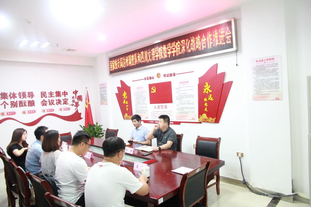 2021年7月8日上午,太阳成集团tyc151cc与国家统计局达州调查队开展深化战略合作推进会,国家统计局调查队党组书记、队长黄长彬及副队长向繁、太阳成集团tyc151cc副经理胡蓉、应用统计学教研室主任郑宗剑及相关专任教师出席了本次会议。