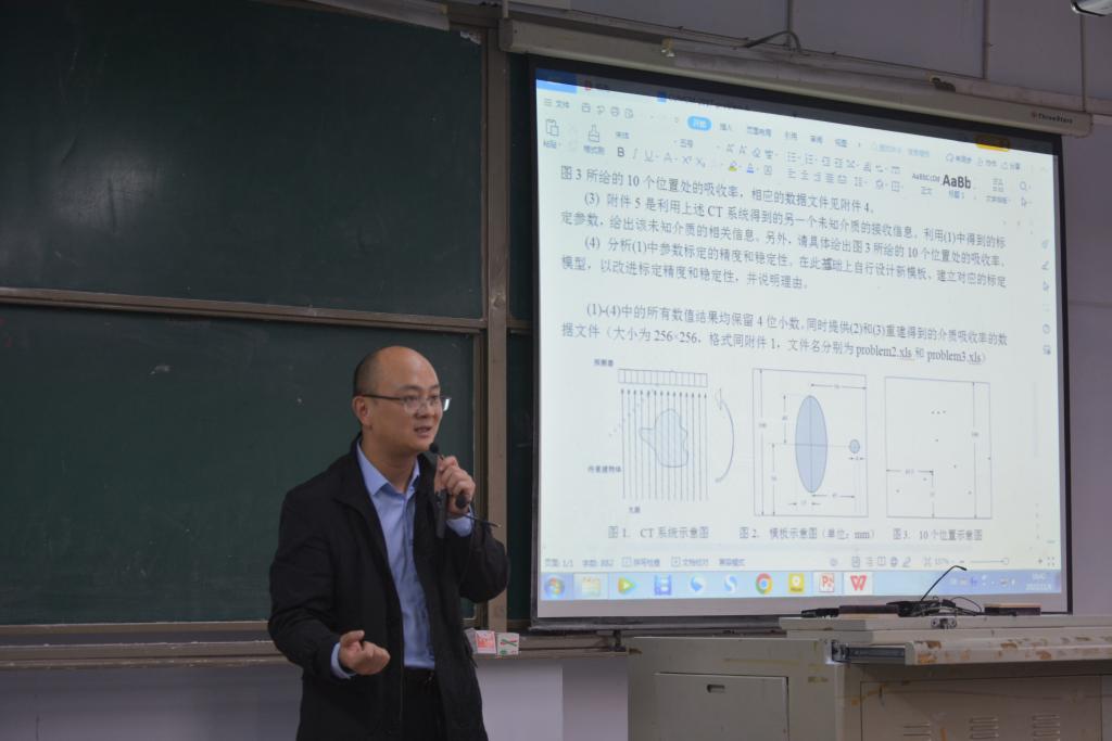 讲座伊始,胡攀老师带领同学们回顾了2017年全国老员工数学建模竞赛A题“CT系统参数标定及成像”的题目和当年的竞赛情况,结合问题给全体同学讲述了数学建模的目的主要是模型建立、程序编写以及小论文撰写三大部分。其次,胡老师从题目阅读、重要信息提取、建模与求解、模型的精度与稳定性分析、新模板设计、模型假设与摘要七个方面详细呈现了2017年A题“CT系统参数标定及成像”的建模全过程。