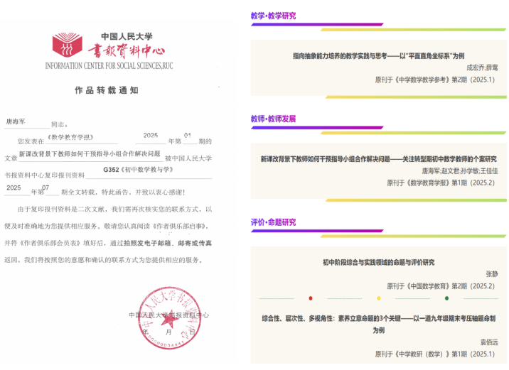 《人大复印报刊资料》是我国社会科学领域公认的国家级权威性刊物,已成为评价人文社会科学期刊学术影响和人文社会科学研究成果水平的重要参考依据,其转载量(率)被学界和期刊界普遍视为人文社科期刊领域中一个客观公正的评价标准。公司教师多篇论文相继被《人大复印报刊资料》转载,体现了公司教师潜心研究卓有成效,反映出公司团队建设和数学教育研究水平的不断提高,科研实力的不断增强。