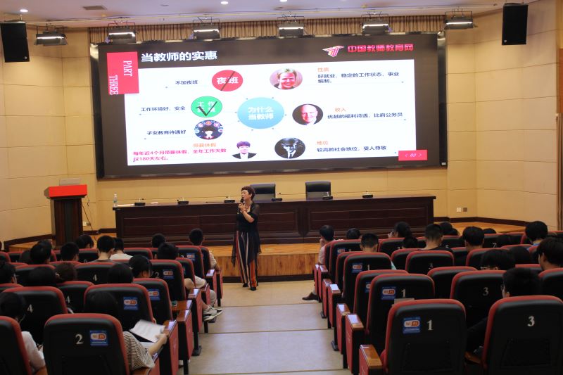 主讲教师阳雪讲师首先用毛泽东的一首诗《咏蛙》来调节现场气氛。随后,从六个部分来为全体师生详细解读了国家教团队格的相关政策。第一部分,关于教师职业。先引入习近平话语:关心教师,弘扬尊师重教的社会风尚,让师生们对老师的理解能更加深刻。随后,从性质、收入、地位、带薪休假、工作环境等七个方面来阐释为什么当教师。第二部分,如何才能当教师。第三部分,如何获得教团队格证。其中包括笔试过关、面试过关、普通话过关、体检过关和个人承诺书五个方面。第四部分,报考对象及学科。阳雪老师例举多组数据让我们了解到了报考教团队格证人数在不断增加,竞争非常激烈,其中非在校生人数多于在校生人数。通过数据的对比,让我们对教团队格证考取有一个准确的认知。第五部分,中国教师教育网介绍。第六部分,报名须知。阳雪老师从多方面、多角度分析了考取教团队格证现状,意在指出考取证书需要一个全面、有系统性的学习方法。