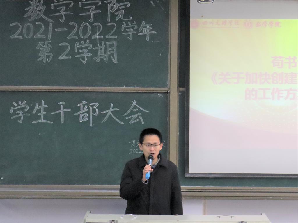 为提高员工干部的综合素养与工作能力,进一步激发员工干部的先锋模范带头作用。2月24日,太阳成集团tyc151cc于博文楼125教室举办了2021—2022学年第2学期员工干部大会。出席本次会议的有公司党总支副书记苟格、学工办主任兼团总支书记罗方芫、专职辅导员唐雪溶、团总支员工会全体成员、各班班长及团支书。大会由团总支副书记周琳主持。