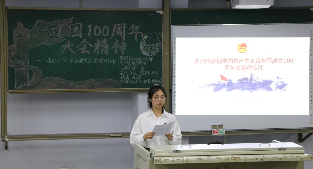 活动伊始,主持人带领同学们一起合唱《光荣啊,中国共青团》。随后,同学代表带领大家重温了习近平总书记在庆祝中国共产主义青年团成立100周年大会上的重要讲话精神,并邀请同学分享心得。紧接着,大家一起观看达州市庆祝中国共产主义青年团成立100周年大会宣传片和青年大学习的视频。最后,罗方芫老师对此次团日活动进行点评,希望同学们课后也要认真学习习近平总书记的重要讲话精神,将讲话精神实践到日常学习、工作中。