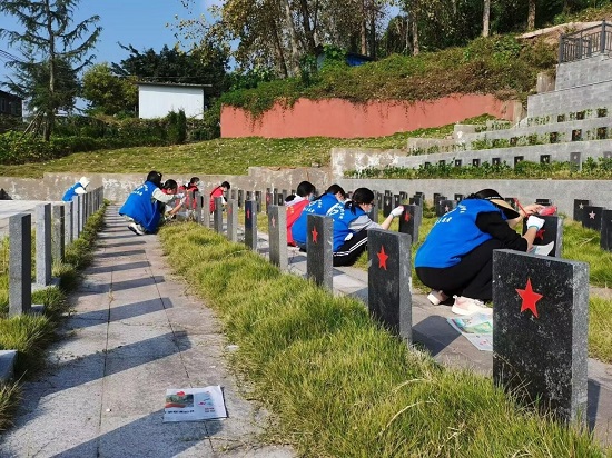 青山有幸埋忠骨,烈士墓前抚英魂。达州市红军烈士陵园邀请志愿者们为烈士墓碑五角星描红以及打扫陵园广场。志愿者们在描红前仔细将墓碑上的落叶杂草灰尘清理干净,或半蹲或半跪,手持描笔,反复描红。每一次清理墓碑陈迹都是对革命历史的哀悼,每一处细致的落笔都是对烈士精神的缅怀,每一座墓碑都是一段传奇的英雄事迹,都是永不熄灭的精神火炬。