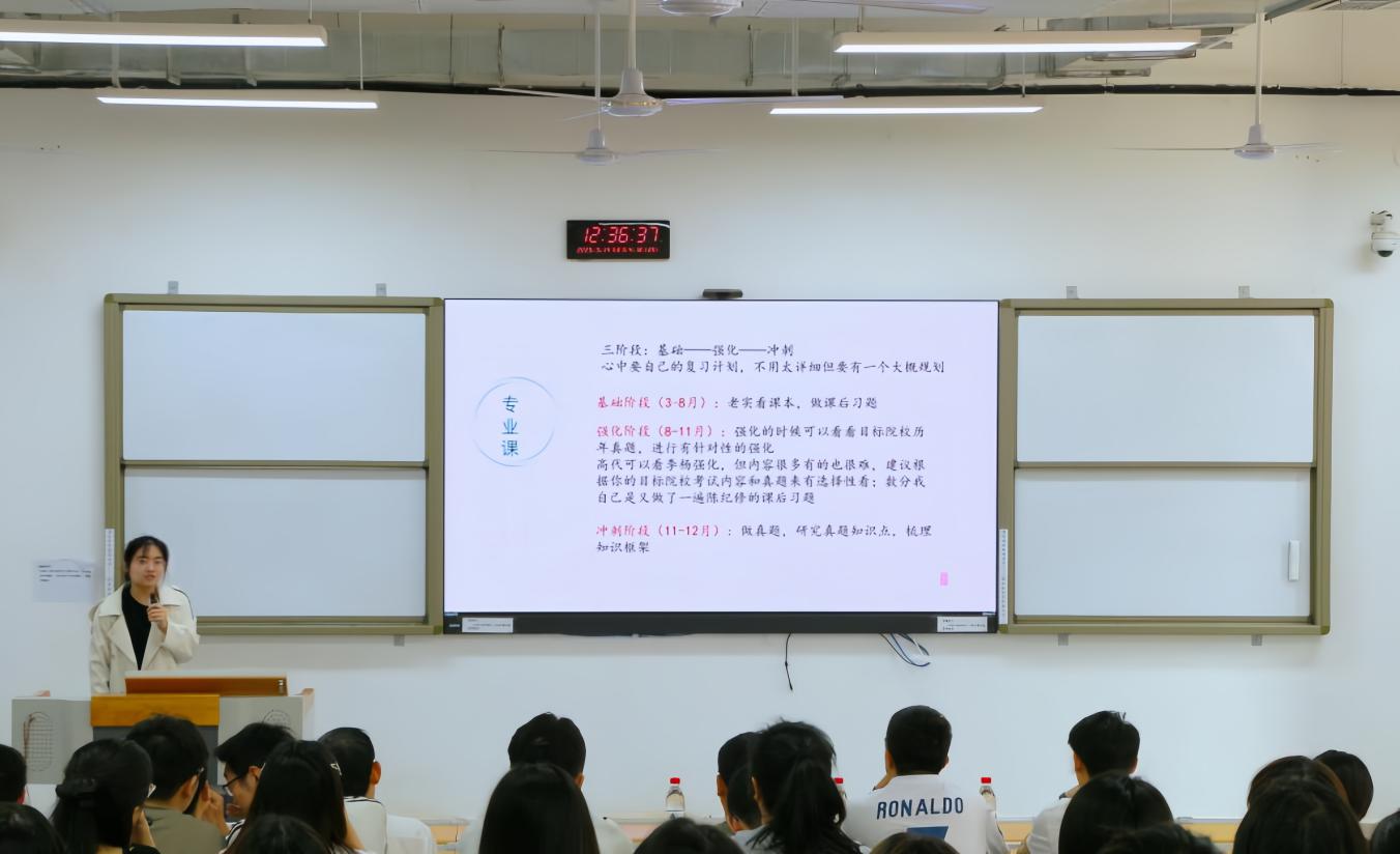在互动答疑环节,同学们聚焦冲刺阶段时间分配、跨省考研、复试准备等具体问题踊跃提问。师兄师姐结合自身备考经历,给出条理清晰、切实可行的解答,既有宏观的复习策略指导,也有微观的细节注意事项提醒。