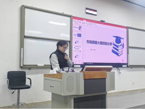 分享会上,甯航则以亲身经历分享实战心得。结合自身参赛经历,从赛制流程、比赛选题、报告撰写、答辩技巧四大维度展开干货满满的分享。他首先拆解了大赛“校赛→省赛→国赛”的分层级递进模式,重点解析了自主命题与企业命题两大赛道的晋级差异,提醒同学们“校赛重规范、省赛重表达、国赛重创新”,提前摸清规则方能少走弯路。在选题环节,他强调“小切口深挖掘、结合热点显价值、匹配能力巧发力”三大原则,结合预制菜、非遗传承等实例,告诫大家避免“大而空”的选题,同时分享了与指导老师沟通、查阅文献验证可行性的实用技巧。报告撰写方面,甯航师兄直击备赛痛点,分享了“先定大纲再设计问卷”“国赛级数据需达千份量级”“融合线上爬虫与线下调研数据”等关键经验,强调要运用3个及以上模型分析,多插入高级图表,确保结论明确、建议可落地。答辩技巧上,他建议同学们多观看往届国赛视频,提前模拟演练、突出核心亮点,预判选题依据、数据合理性等常见提问方向,同时注重团队分工协作,避免冷场或重复回答。分享过程中,甯航师兄还穿插了备赛避坑指南,如问卷设计需匹配模型需求、避免全单选多选题型、拒绝AI生成结论建议等,实用性极强,让在场同学受益匪浅。