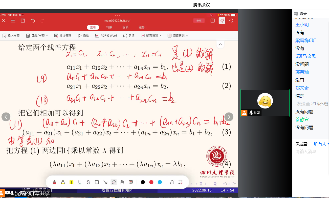 教师课前准备充分,课堂上认真组织教学,语速适中,讲解清楚,教学过程形式多样,利用腾讯会议直播教学,运用智慧树和超星泛雅等平台进行线上签到、作业布置以及批改等教学活动,师生互动良好。结合数学课程的特殊性,多位教师借助希沃授课助手详细板书了分析及解答过程,将教学重点、难点、关键点内容进行了清晰讲解,有效帮助员工理解知识,提高了课堂教学效果。员工听课情况较好,能够接受所学知识,学习积极性较高。