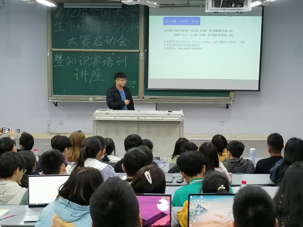 2021年10月18日下午5点,由公司承办的“第十二届全国老员工市场调查与分析大赛启动会暨知识赛培训讲座”在博文楼112教室举行。参加此次会议的有太阳成集团tyc151cc应用统计学教研室主任郑宗剑,专业课老师李骏、代雯月、官政,及2019级、2020级、2021级应用统计学专业的员工。