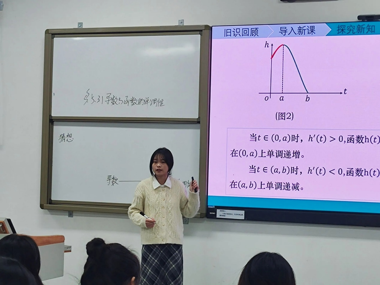 本次教学能力大赛决赛主要是模拟授课环节,考察参赛者对教材理解是否清晰、教学目标是否明确、教学重难点是否突出;同时要求选手们教学环节自然,板书整洁、讲授生动形象;展现师范生的认真、严谨精神风貌。最后,2022级2班的员工杨露在《导数与函数的单调性》的模拟课堂中,采用情境-问题教学模式,围绕核心问题,借助信息技术手段突出重点和突破难点,以清晰的思路与自然的讲解,获得一等奖;曹乐迪,李慧美获得二等奖,李佳节,马康,张煜薇,刘思妍,万成稀获得三等奖。