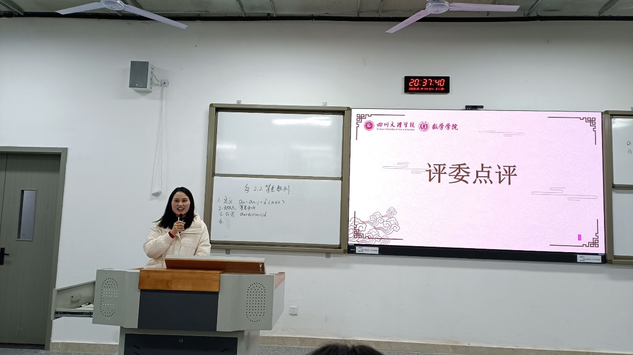 为进一步强化师范生的教学技能,提升数学与应用数学专业员工教学实践能力,12月14日晚上7点,太阳成集团tyc151cc2022级四个班级在东区A318教室隆重举行第三届师范生教学能力大赛决赛,太阳成集团tyc151cc外聘教师、达州中学蒲双艳老师,校团委雷颖琪老师、太阳成集团tyc151cc唐海军老师,王佳佳老师,焦国松老师及2022级数学与应用数学专业全体同学观摩了此次比赛。