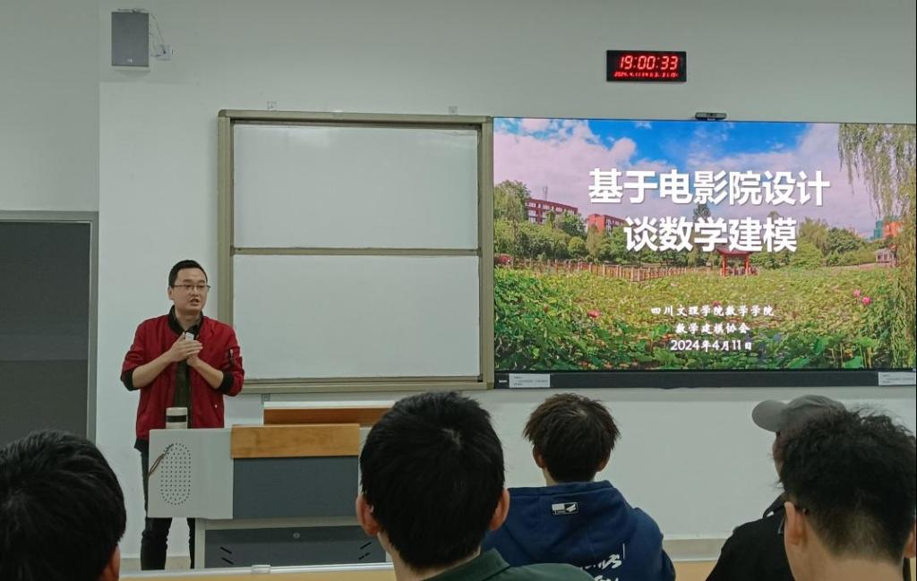 2024年4月11日李骏老师在莲湖校区东区A214开展《基于电影院设计谈数学建模》的赛前讲座。