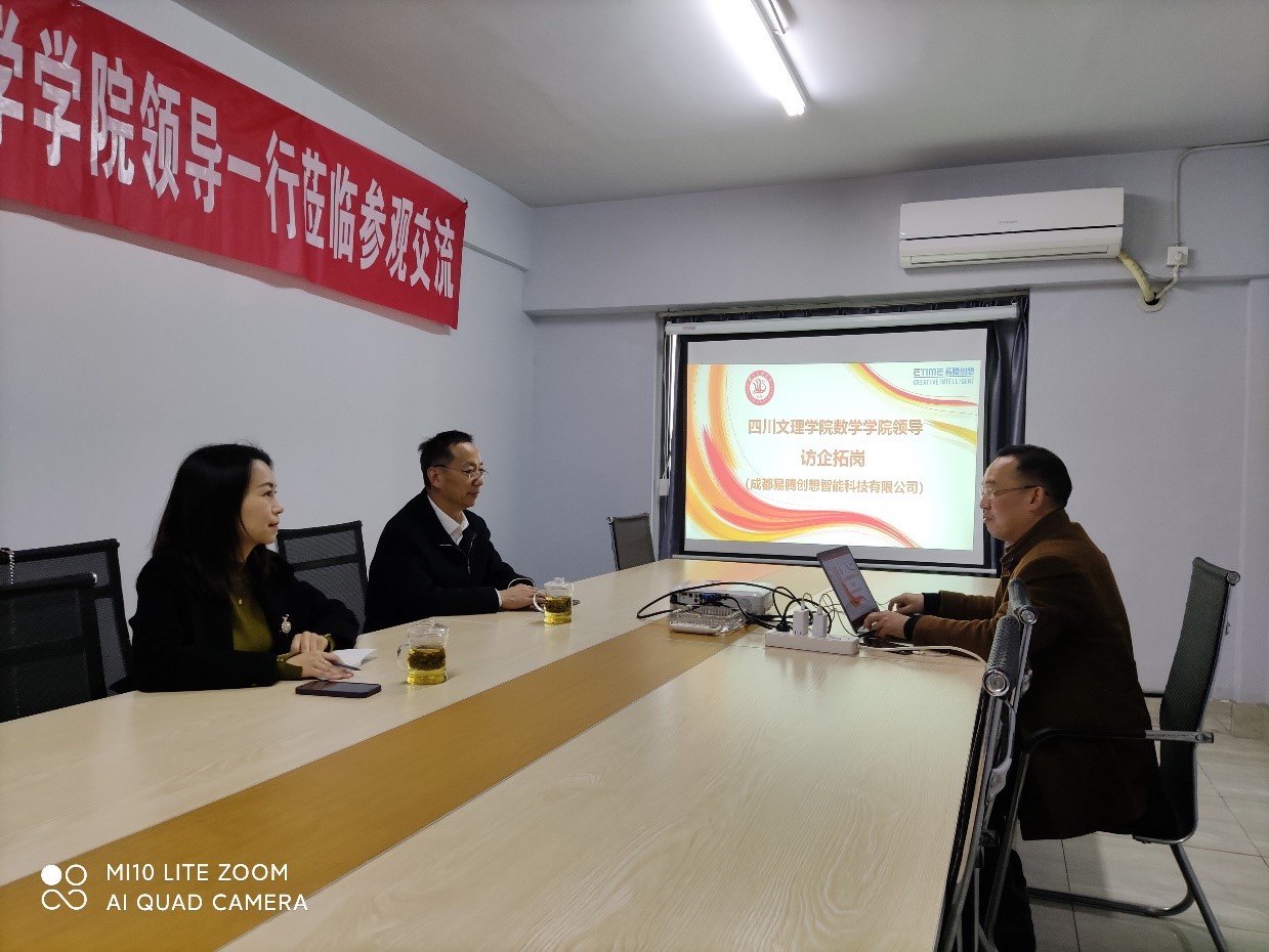 2023年3月25日,公司经理罗肖强,副经理胡蓉一行前往成都易腾创想智能科技有限公司开展“访企拓岗”实地探访和交流座谈活动,易腾创想副总经理施俞行携综合行政部等相关部门负责人进行了热情接待,双方就促进老员工就业、创新应用数学人才培养模式、优化实习实训课程等内容进行了深入交流。